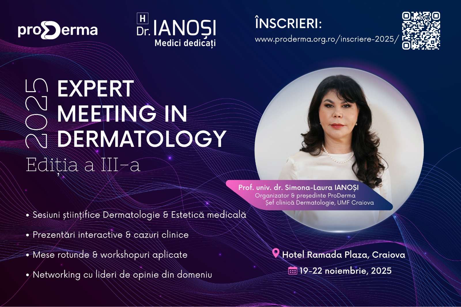 Asociația Profesională 𝐏𝐫𝐨𝐃𝐞𝐫𝐦𝐚 are deosebita plăcere de a vă invita să participați la cea de-𝐚 𝐈𝐈𝐈-𝐚 𝐞𝐝𝐢𝐭̦𝐢𝐞 𝐚 𝐂𝐨𝐧𝐟𝐞𝐫𝐢𝐧𝐭̦𝐞𝐢 𝐍𝐚𝐭̦𝐢𝐨𝐧𝐚𝐥𝐞 „𝐄𝐱𝐩𝐞𝐫𝐭 𝐌𝐞𝐞𝐭𝐢𝐧𝐠 𝐢𝐧 𝐃𝐞𝐫𝐦𝐚𝐭𝐨𝐥𝐨𝐠𝐲”, ce va avea loc în perioada 𝟏𝟗-𝟐𝟐 𝐧𝐨𝐢𝐞𝐦𝐛𝐫𝐢𝐞 𝟐𝟎𝟐𝟓, la 𝐇𝐨𝐭𝐞𝐥 𝐑𝐚𝐦𝐚𝐝𝐚 𝐏𝐥𝐚𝐳𝐚, 𝐂𝐫𝐚𝐢𝐨𝐯𝐚.